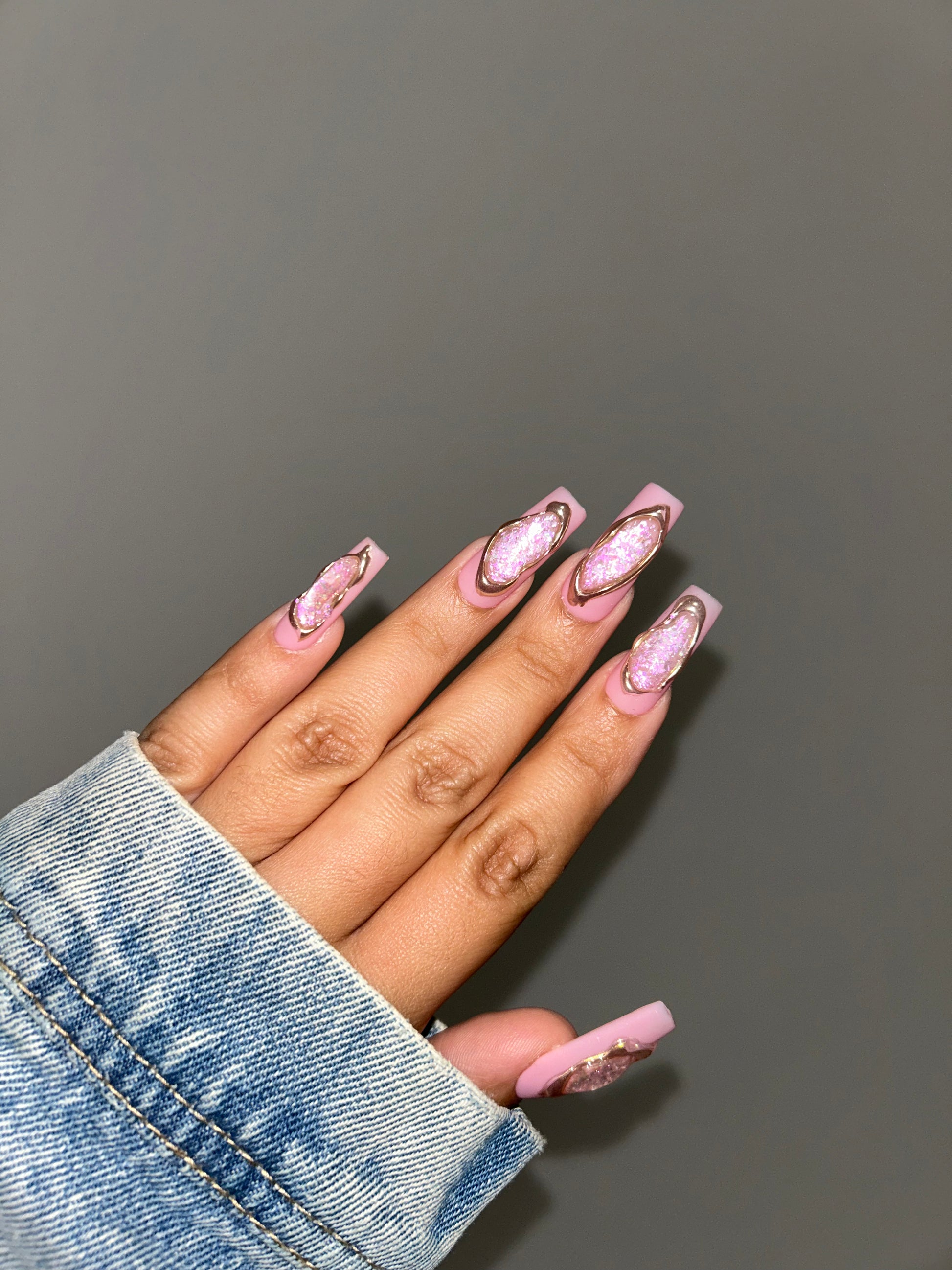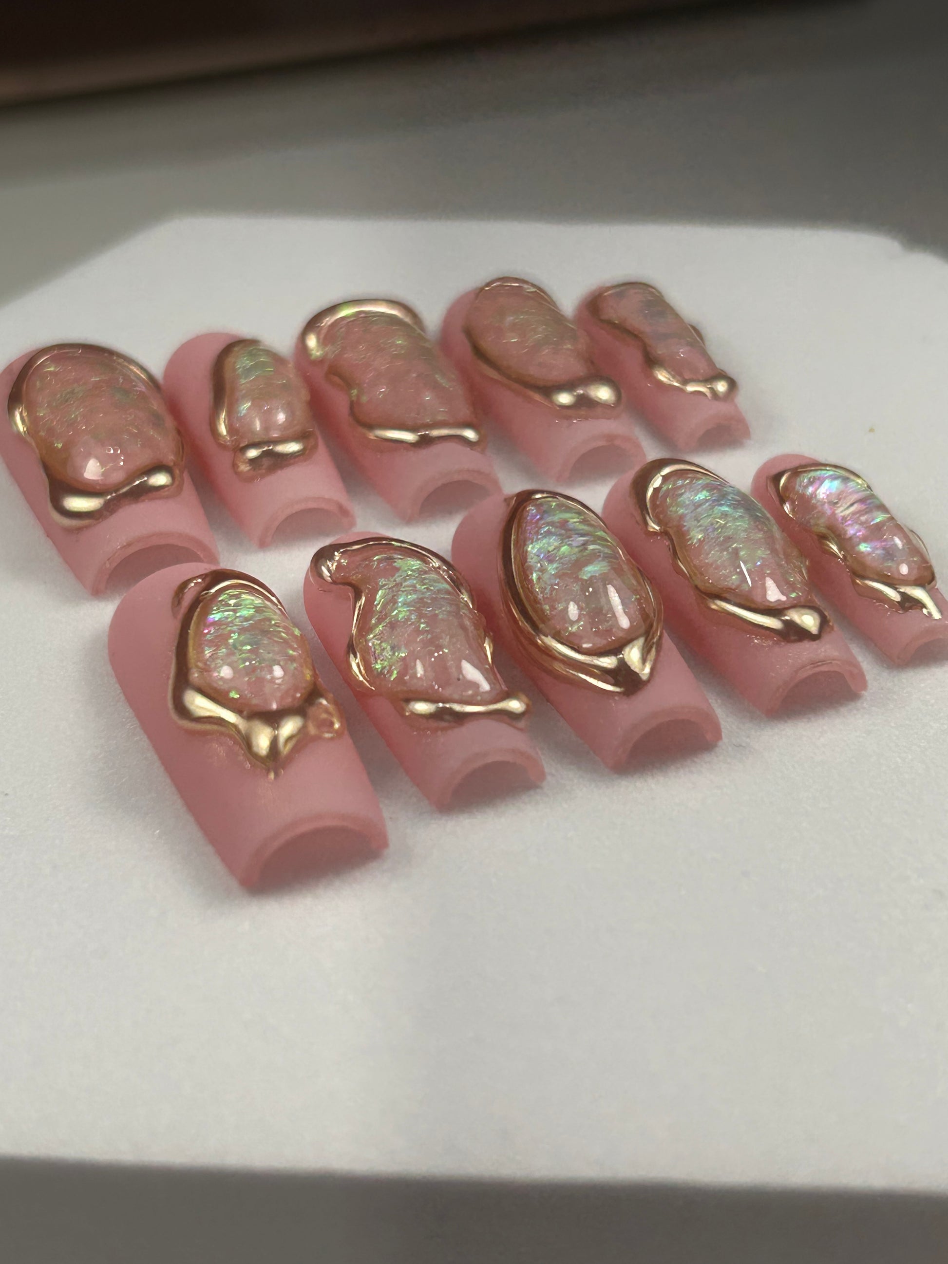 A true gem for your fingertips. This luxury press-on set features encapsulated iridescent flakes, sealed with 3D gel artistry to create the illusion of a luminous opal stone. Each nail is crafted with depth, dimension, and an ethereal glow that shifts with every angle of light.