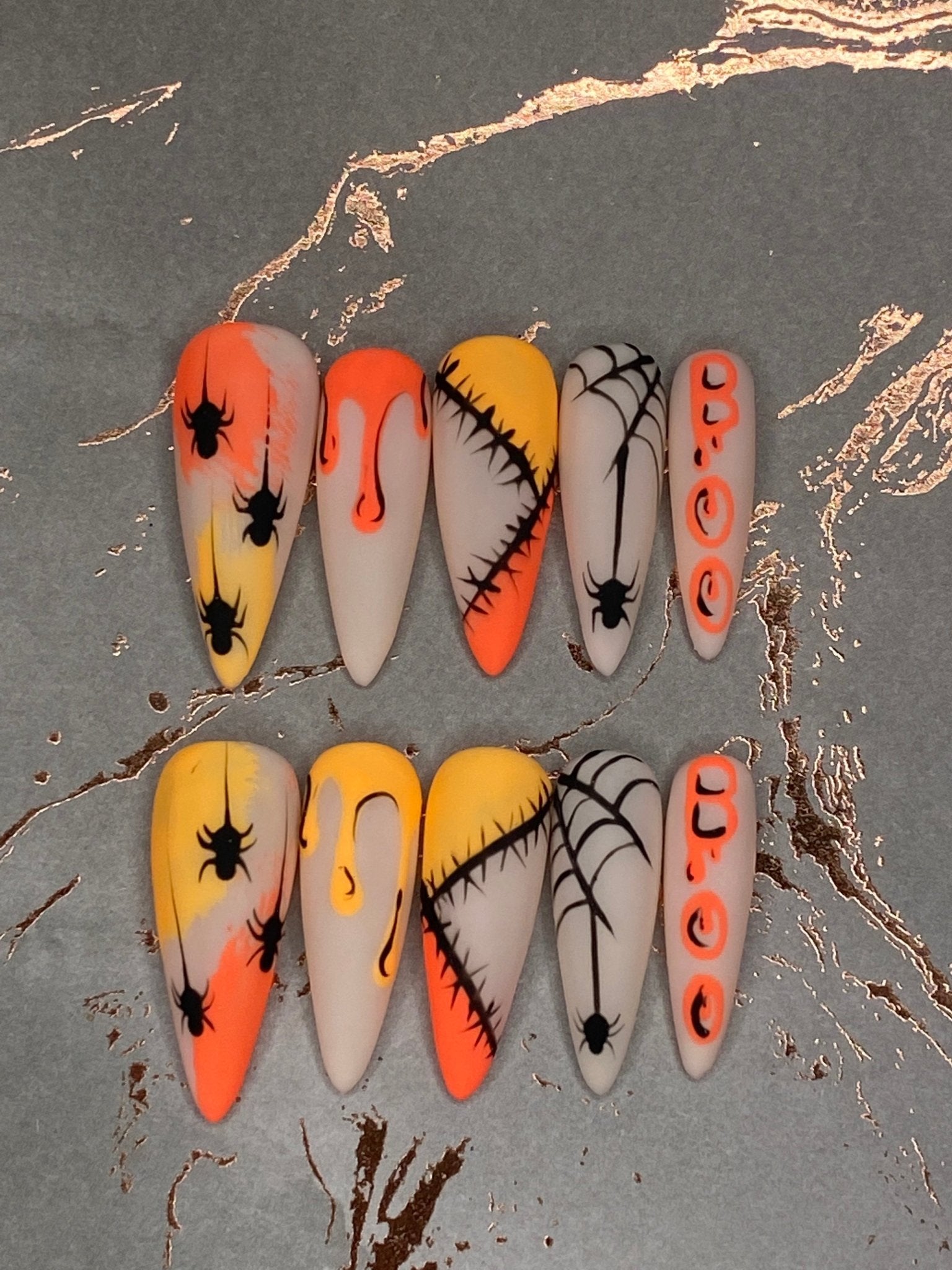 These nails feature a striking neutral nude base adorned with hand-painted 'BOO!' text, scarecrow patches, and spooky spiders. The 'BOO!' design adds a playful touch, while scarecrow patches and realistic spiders provide a spooky vibe. With matte finish, these nails are perfect for elevating your Halloween look. Get ready to make a statement at your Halloween parties with these stylish and festive press-on nails."