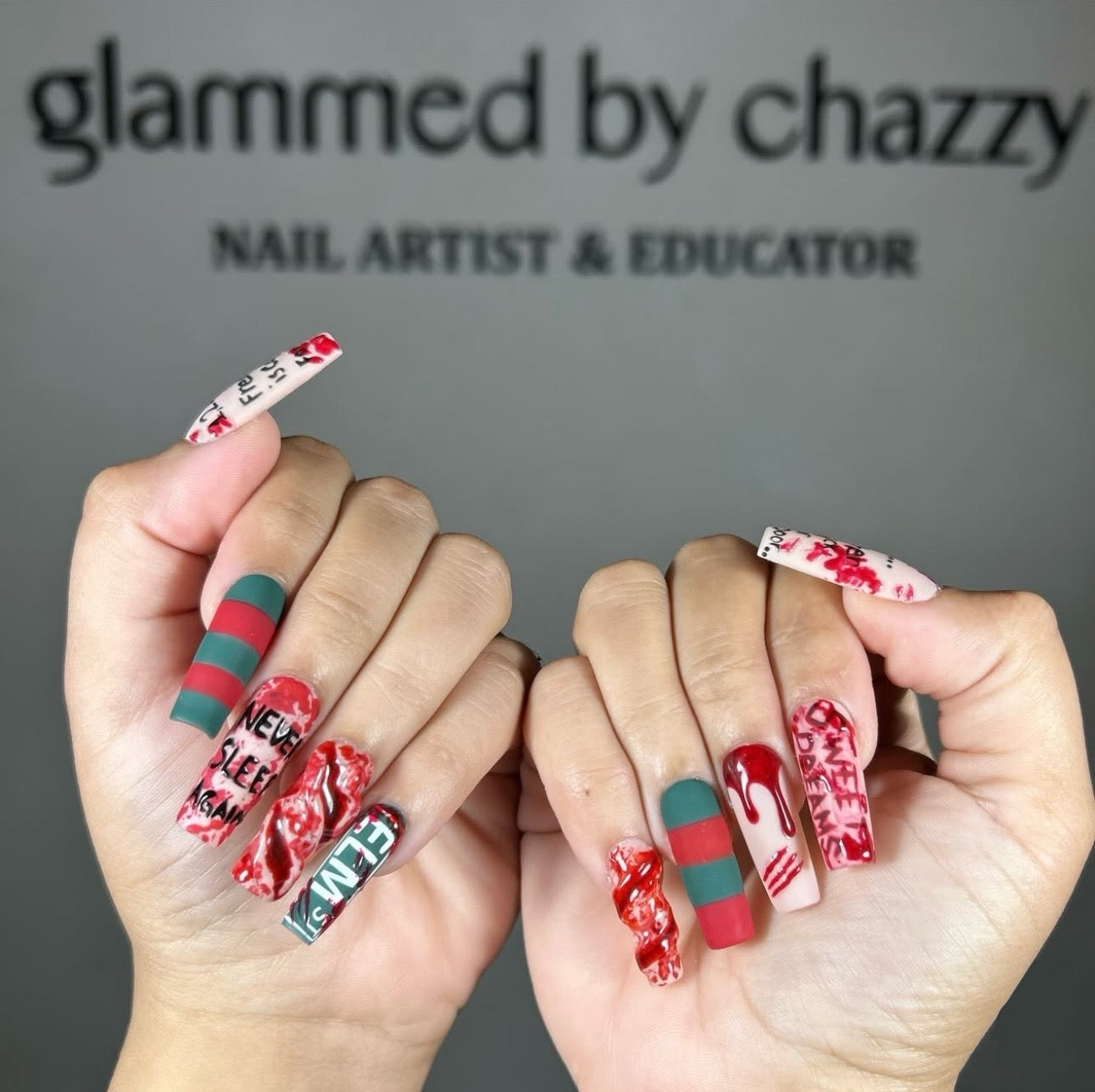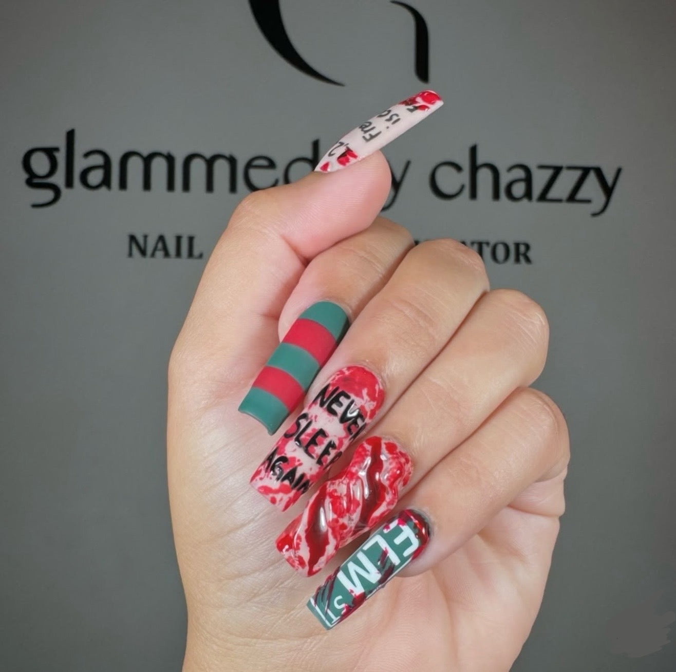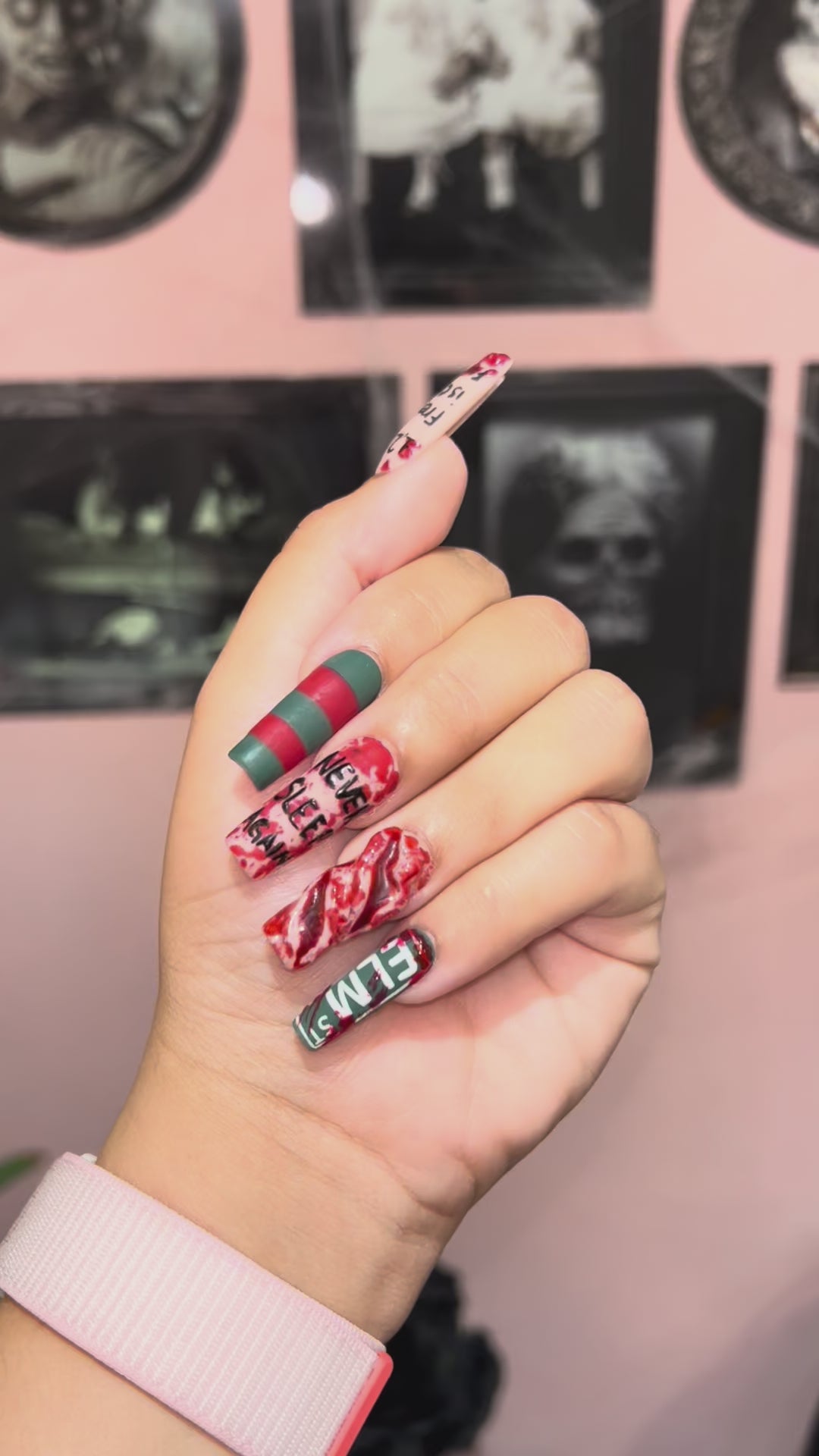 Step into your darkest dreams with this Nightmare on Elm Street-inspired press-on set, hand-painted to perfection for true horror lovers and nail art collectors. Every detail is designed to stun — from Freddy’s iconic red-and-green stripes to blood-splattered effects, eerie lettering, and haunting 3D textures.